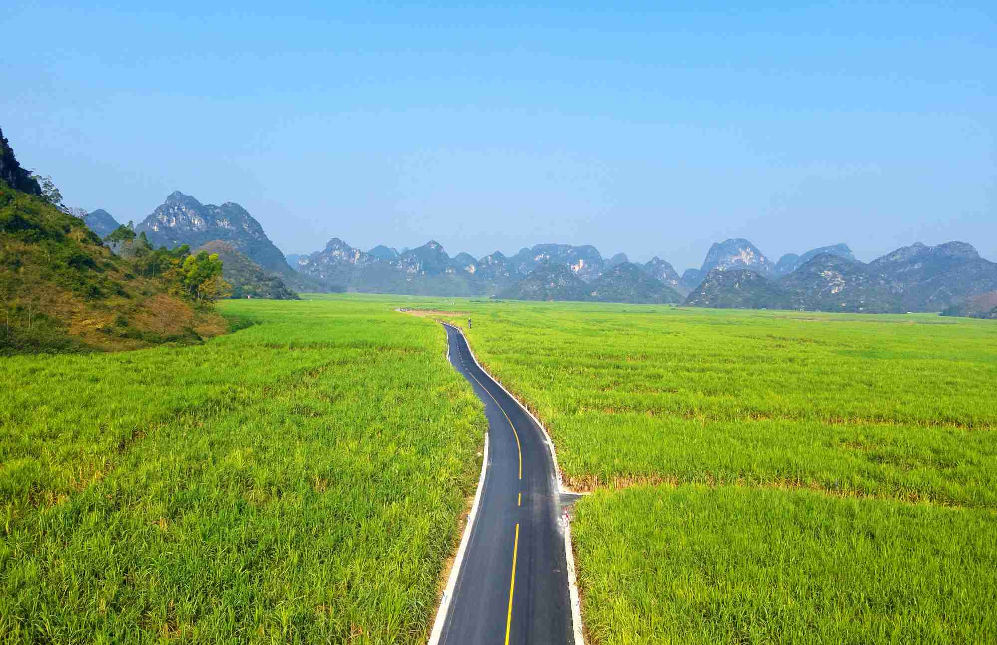 冬阳初升,晨雾在贵港覃塘田垄间渐散,省道308线东龙至樟木段浸在一片清透的天光里。新铺的沥青路如展平的黑缎,泛着软润光泽,黄色中线似绣面金丝,顺着公路走势蜿蜒,一路延伸向喀斯特峰林的浅黛褶皱间。