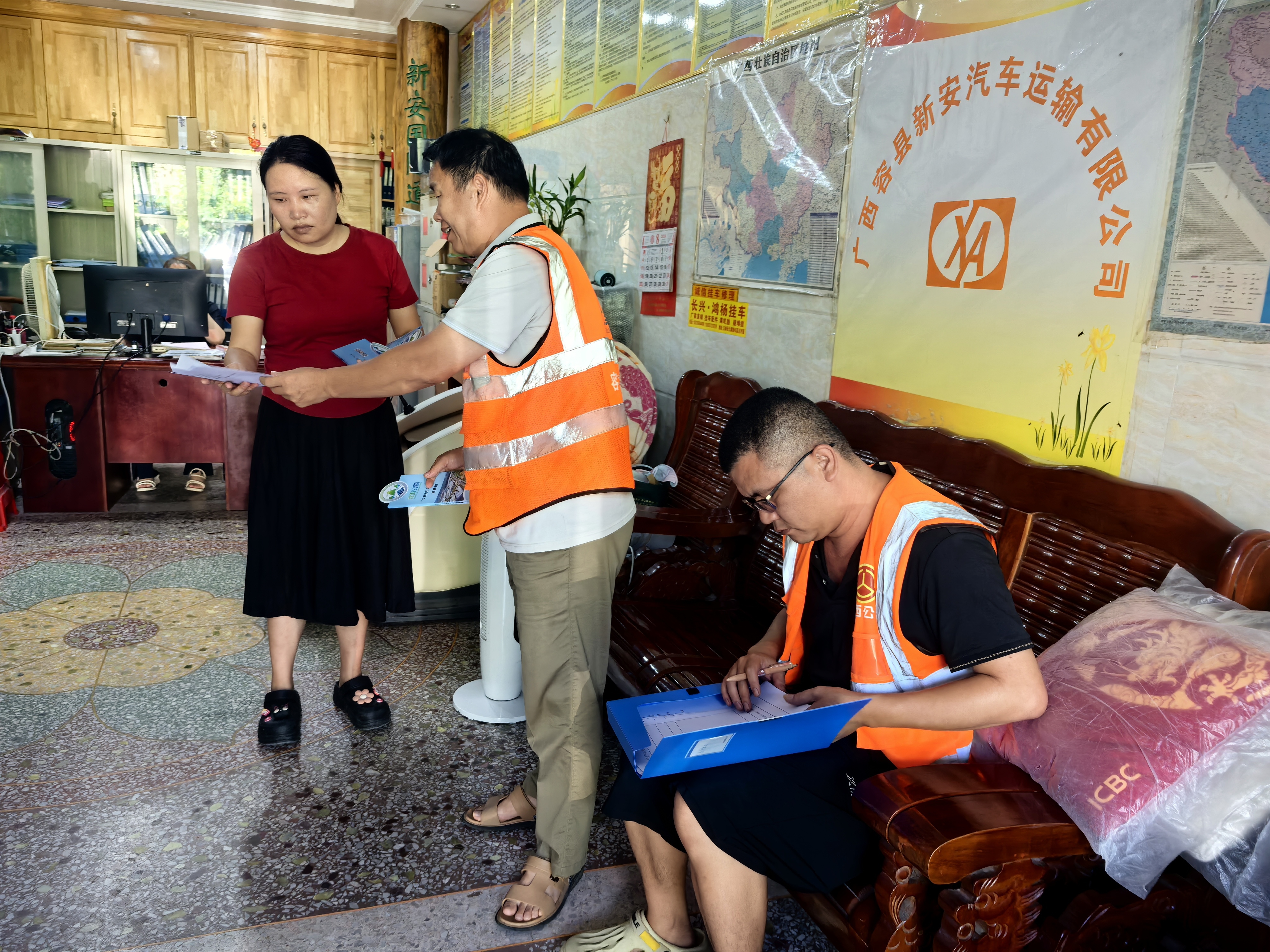 容县公路养护中心工作人员在广西容县新安汽车运输有限公司发放政策解读手册。