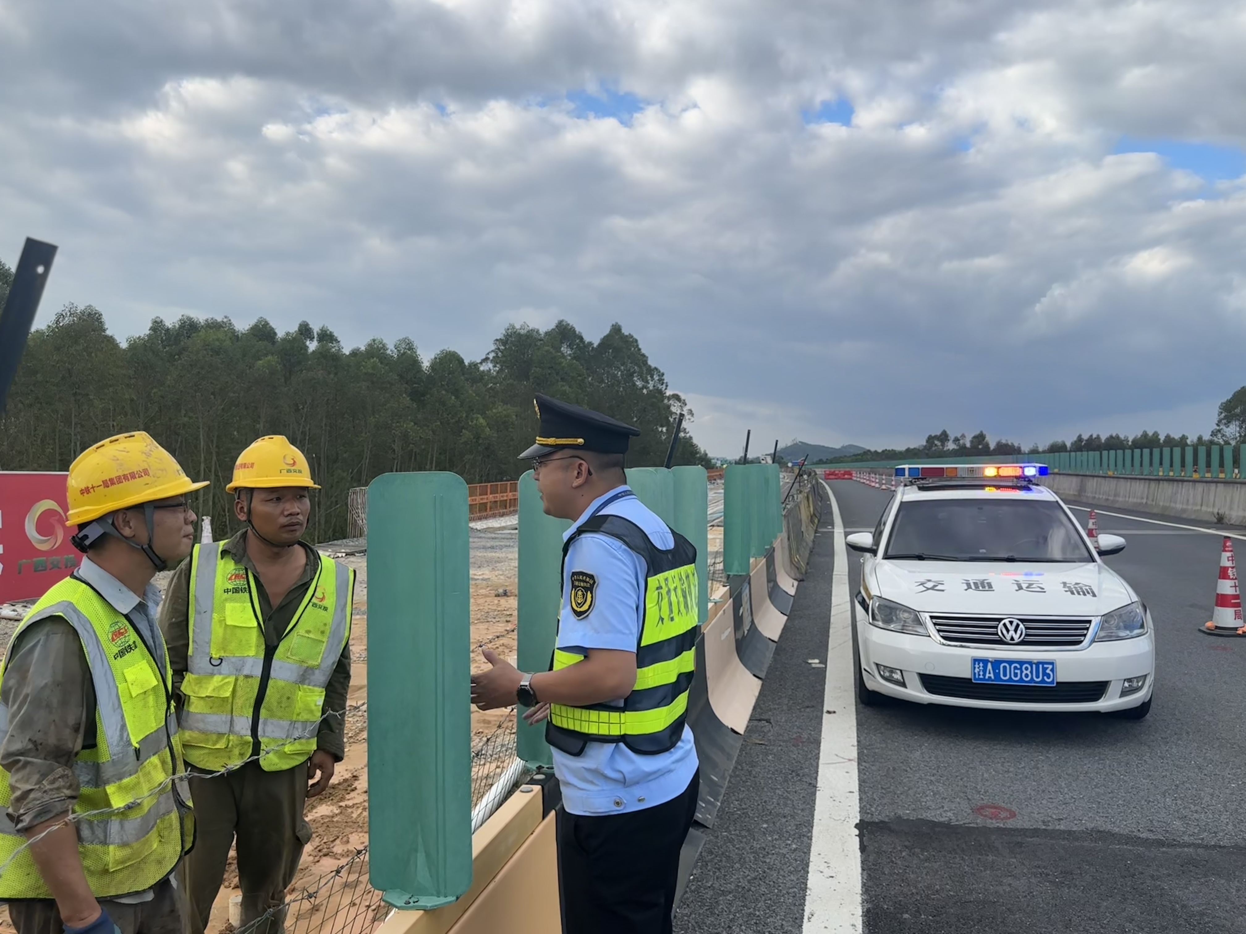 玉林讯通讯员 何山 摄影报道)为有效应对今年第18号台风“桦加沙”,保障辖区高速公路安全畅通,近日,自治区交通运输综合行政执法局第六支队第五大队联合兴业县公安局交通管理大队、中铁建公路运营有限公司南玉珠项目经理部前往辖区G0412深南高速玉横段、G59呼北高速荔玉段共线扩容工程开展防台安全生产检查。