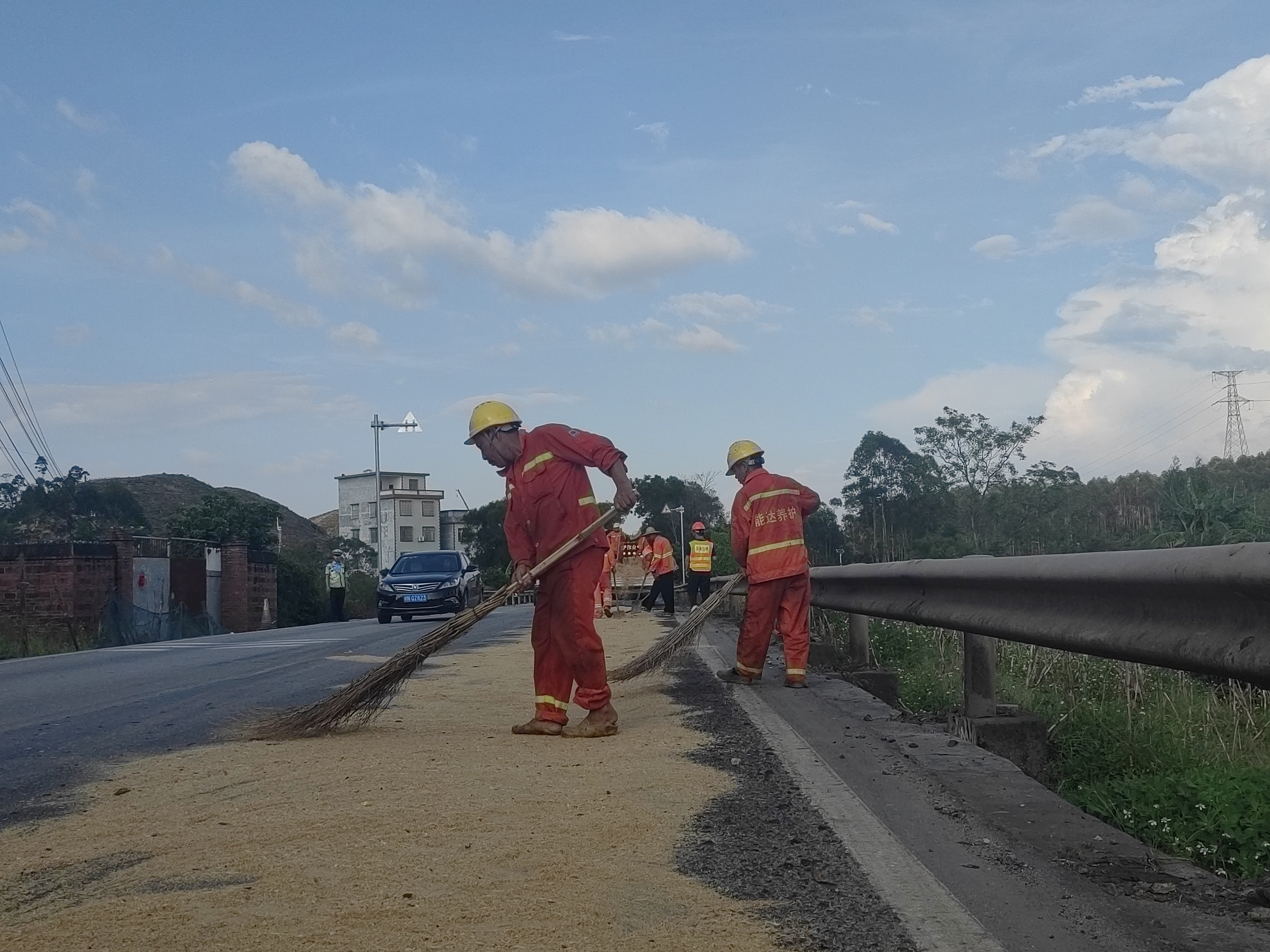 钦南公路养护中心养护人员清理辖区省道312线乐民至峒中公路康熙岭镇西围村至诗家路口路段路面油污。