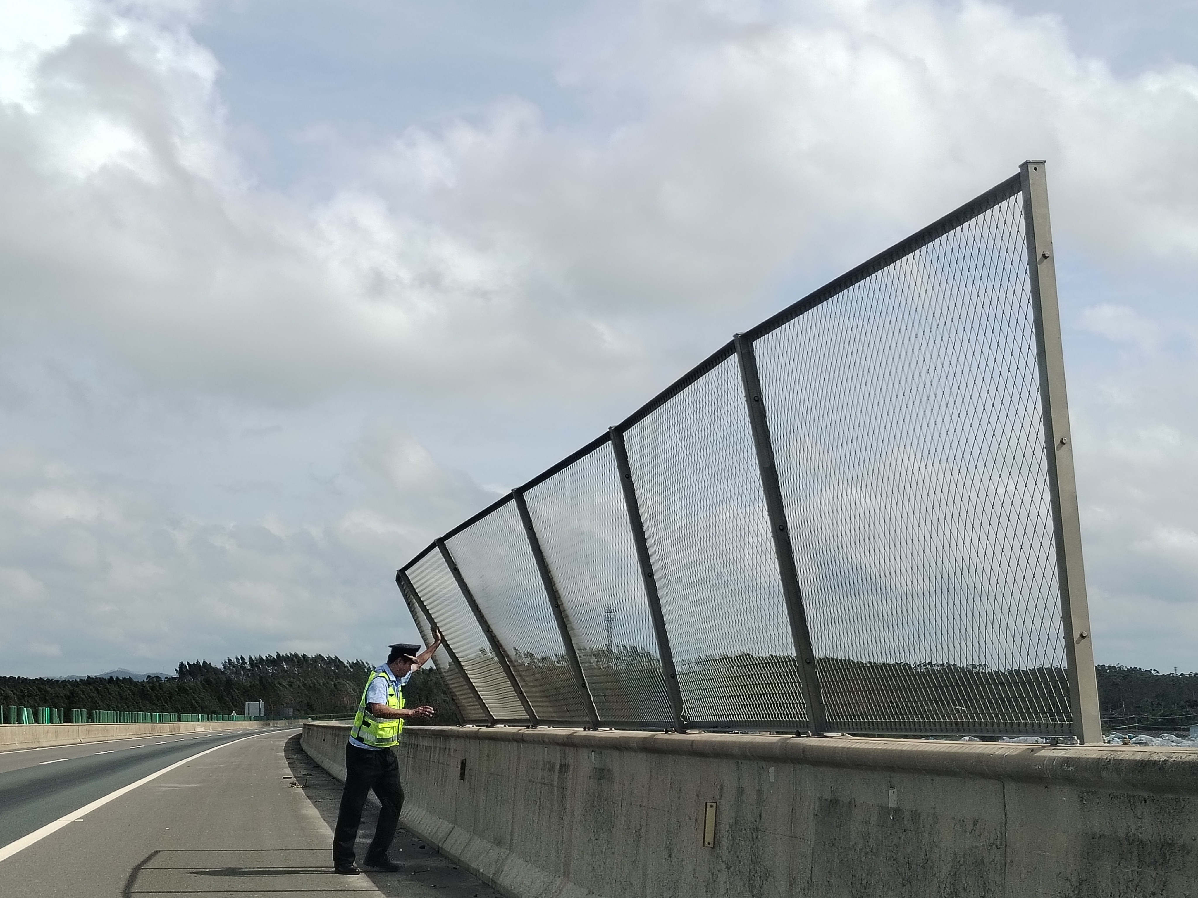 自治区交通运输综合行政执法局第九支队第四大队执法人员检查G59线呼北高速下行线头港大桥防护栏设施。