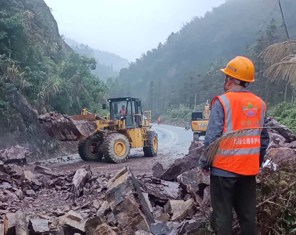 临桂公路养护中心工作人员在国道321线临桂区宛田瑶族乡东长岭村路段清理滑坡落石。