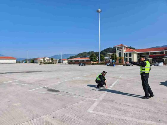 自治区交通运输综合行政执法局第四支队第四大队执法人员在中峰服务区检查停车位标线。