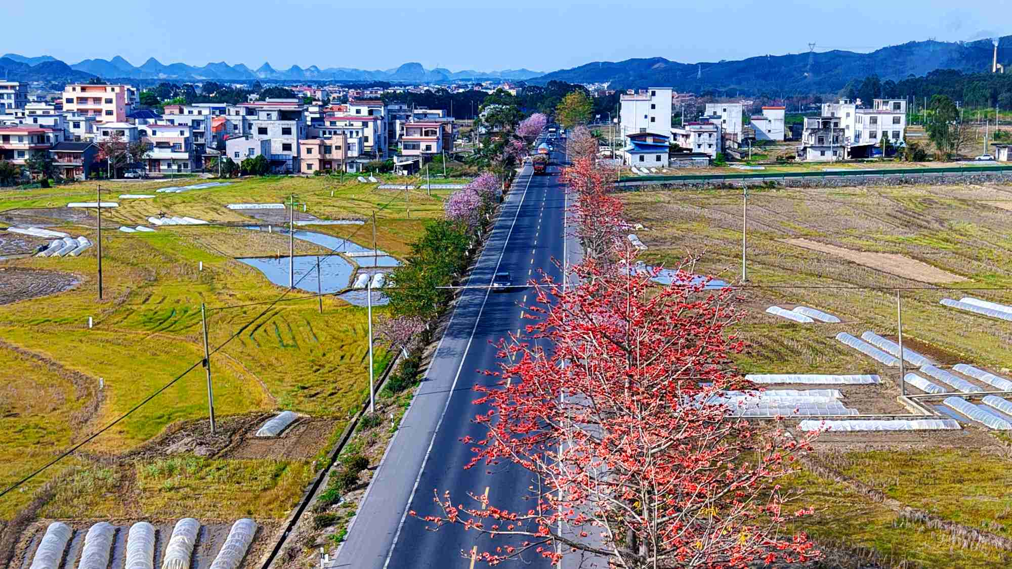 公路两侧的村落,是散落春野的珍珠。白墙灰瓦的民居,在花树与田畴间静静伫立。有的人家屋顶飘着淡蓝炊烟,袅袅融进天空,那是春日最暖的烟火气;有的院墙边探出几枝早开的三角梅,玫红花瓣与木棉遥相呼应。远处的喀斯特峰林在薄雾里若隐若现,黛色山影与淡蓝天空相接,如晕染的水墨,将春景衬得愈发悠远。