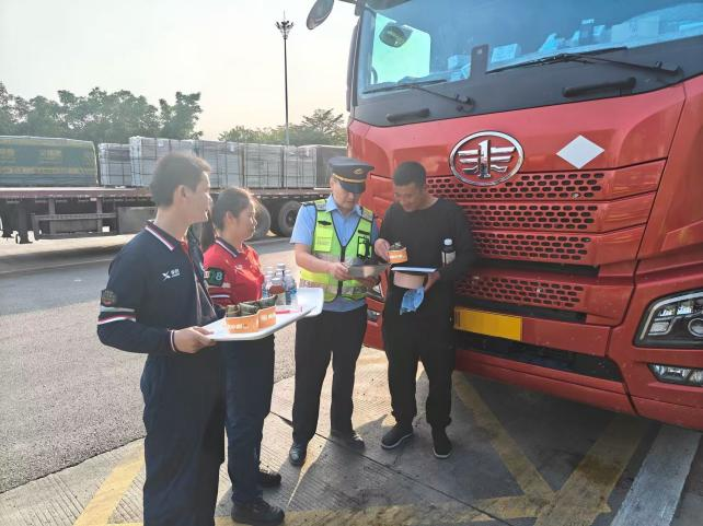 活动中,联合工作人员主动为停靠休息、加油补给的货车司机送上茶水、糍粑等暖心物资,通过贴心问候缓解货车司机长途奔波的疲惫,传递执法温度。同时,结合货运行业特点和辖区道路实际,采取“案例+法条”的形式,重点解读超限超载、非法改装、无证营运等违法行为的法律后果,提醒广大司机严守安全底线、依法合规经营。针对司机普遍关注的运输纠纷、权益维护等热点问题,现场逐一耐心解答,并指导货车司机使用12328交通运输服务监督电话,切实提升货车司机的法治意识和维权能力。