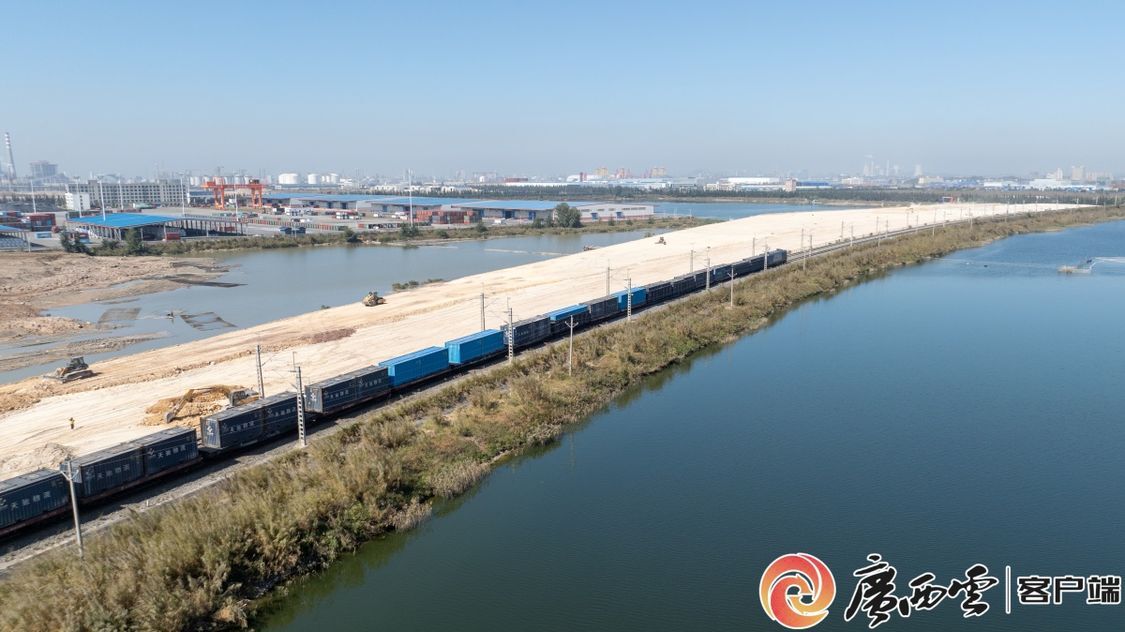一趟满载集装箱货物的西部陆海新通道铁海联运班列,从钦州港东站缓缓驶出。何家海 摄