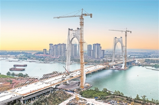 ②1月27日,在平陆运河沙井钦江大桥,工人们在做最后的合龙准备。该桥是钦江与茅尾海分界的标志桥梁,主跨270米,主桥箱梁采用混凝土分离式双边箱断面,共分为87个梁段。