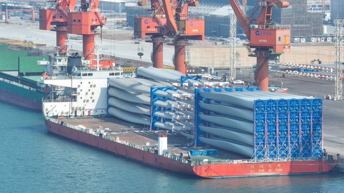货轮甲板上整齐码放着风电叶片(央广网发  广西北部湾国际港务集团有限公司供图)