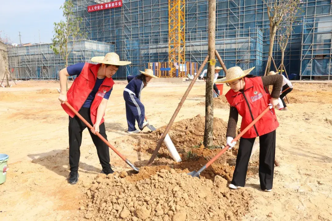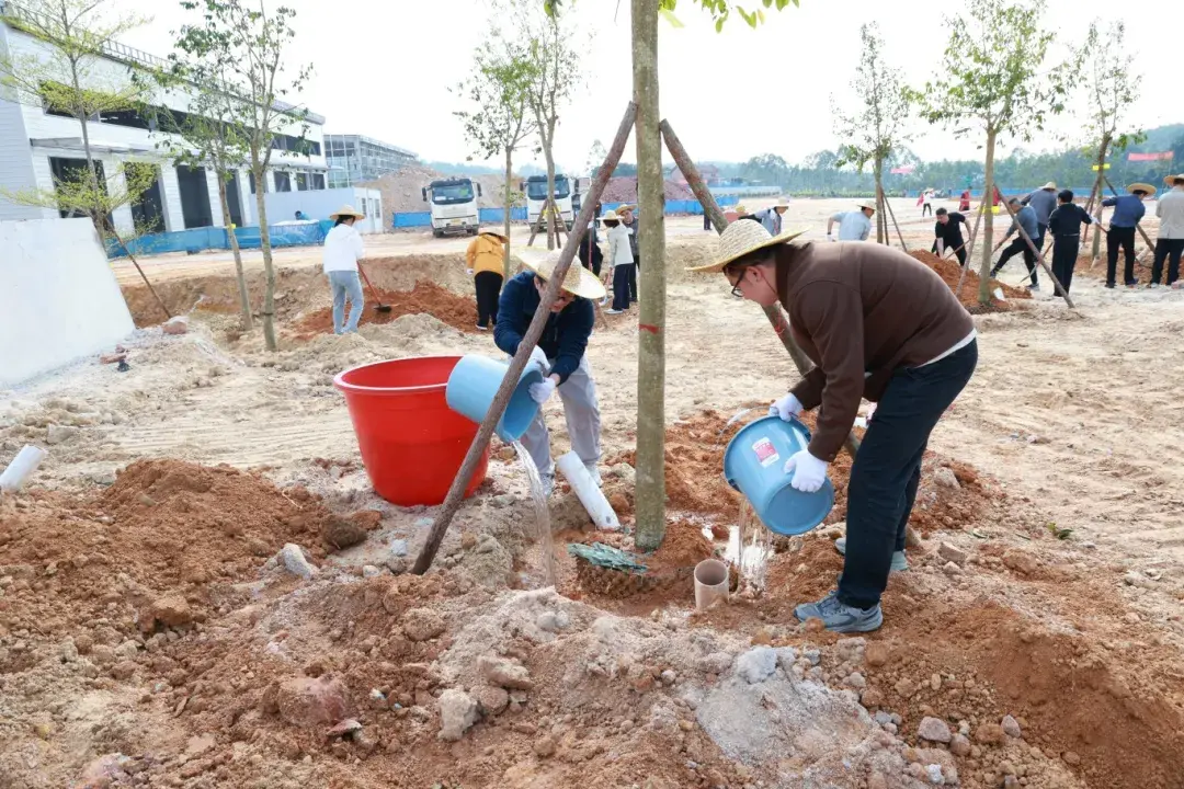 植树现场,春风和煦。全区交通运输行业16家单位、院校及企业共130名干部职工、志愿者,三五成组,手持铁锹、水桶等工具,分工协作,挥锹铲土、提水浇灌,合力种下一株株苗木。经过一个多小时的忙碌,新栽的树苗迎风挺立、错落有致,为初春的南宁增添了一片生机盎然的绿意。