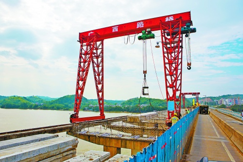 79日,藤县西江大桥正在进行梁板拆换施工作业。