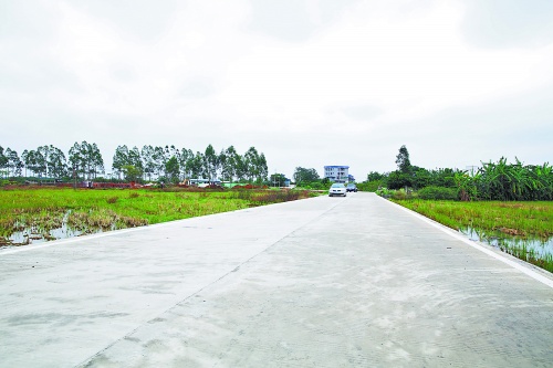 笔者驱车来到宾阳县古辣镇蔡村路口,笔直宽阔的水泥路通向远处的村子,道路两旁是刚刚收割完的连片的稻田。古辣镇至蔡村公路今年10月底刚刚完成路面改造,路面宽7米,全长约1.2公里,总投资约163万元。