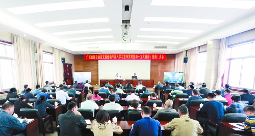 南宁讯(李雪芝 吴君馨 通讯员 韦瑞雪)11月8日,自治区交通运输厅召开深入学习宣传贯彻党的十九大精神(视频)大会,要求全区交通运输系统干部职工迅速掀起学习宣传贯彻党的十九大精神的热潮,全面准确学习领会会议精神实质和丰富内涵,努力把学习成效转化为推动工作落实的动力,不断开创新时代交通运输建设改革发展的新局面。自治区交通运输厅党组书记、厅长潘巍出席会议并作重要讲话。厅党组成员、副厅长周一农主持会议。