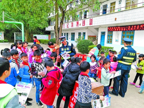 执法人员向学生发放安全宣传读物。