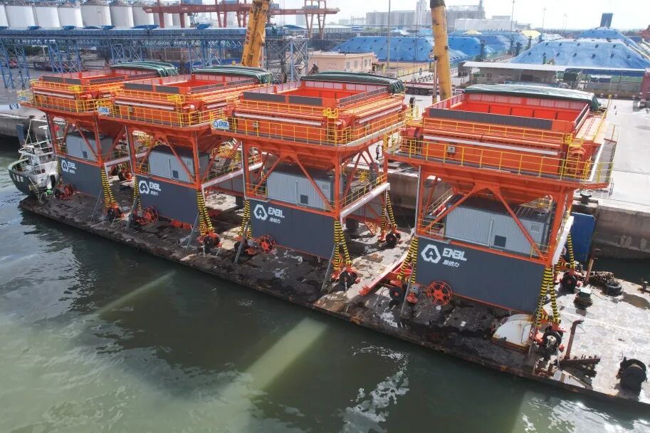 在技术、调度等多部门的协调下,4台除尘漏斗抵抗台风影响,顺利逐一上岸,最后由拖车牵引至指定位置,通电调试后将正式执行生产作业任务。