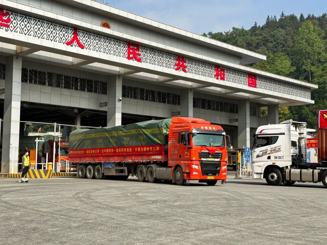 中国龙邦—越南茶岭国际性口岸(含中国那西—越南那弄通道)货车正有序通关。