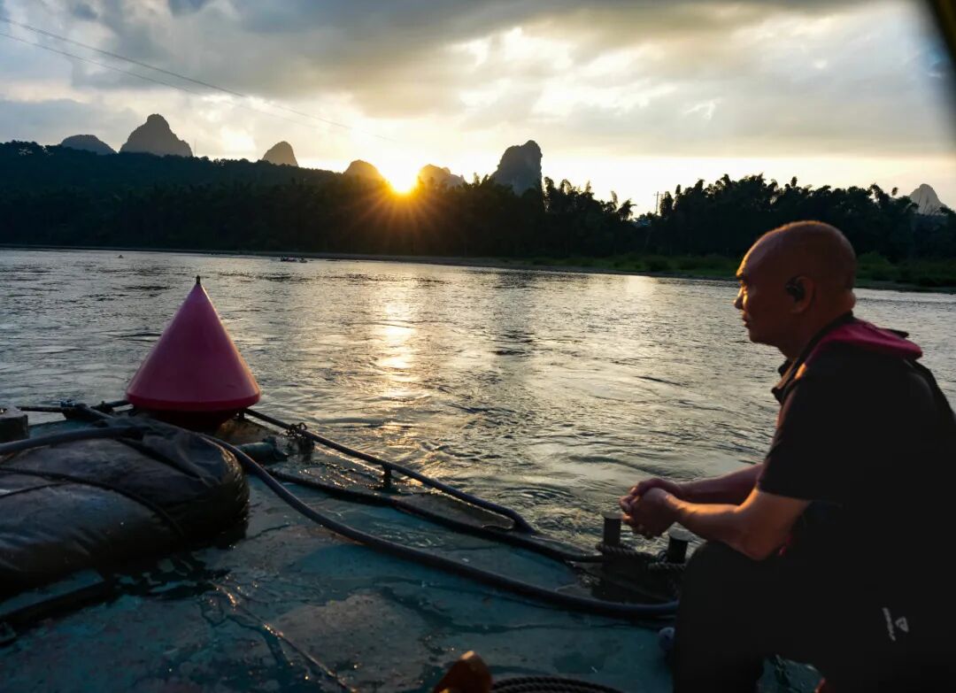 清晨6点,天刚亮,桂林航道养护中心阳朔航道站“航道管理516”号工作船就逆流而上,开始巡航检查工作。“为避免影响航运,我们要赶在从桂林下来的游船到达巡航终点——杨堤之前,完成巡航任务返航。漓江枯水期从9月开始,一直到第二年的3月底。水位每下降一厘米,我们的心就紧一分。”周文指着正在安装的锥形航标说,“枯水期江面宽度只有丰水期的四分之一,受过往游船上航冲滩扰动河床等各种因素影响,部分滩险处水深有时不足60厘米。我们的工作就是在这条‘收缩’的河道上航行,为每一艘游船‘划’出安全的通道。”他双手紧握着船舵,目光始终紧锁着前方蜿蜒的河道。