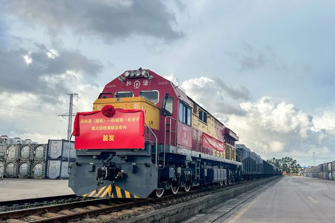 广西开出首趟越南同奈港至新疆氧化铝铁海联运专列从防城港站首发。