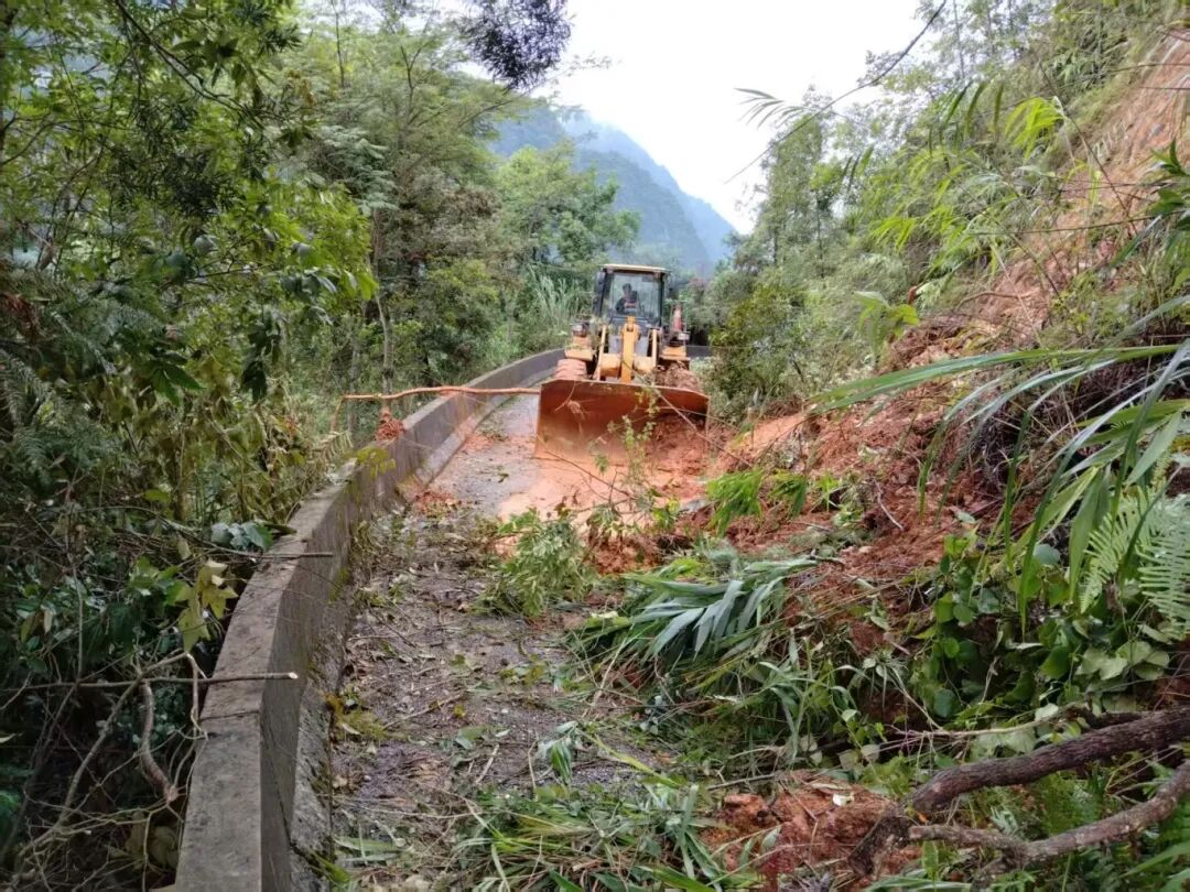 靖西市交通运输局组织机械力量在三合至那万路段清理边坡滑坡。