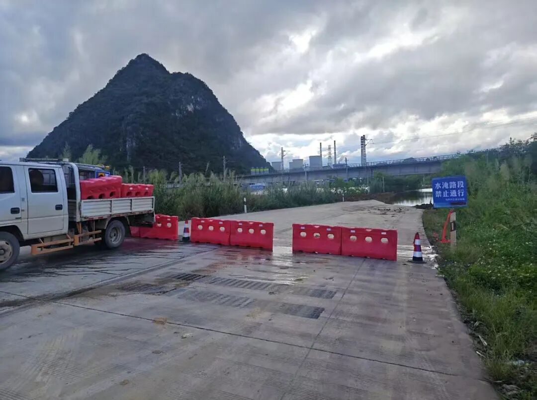 靖西市交通运输局在百靖高速新发联线水淹路段设置安全隔离墩。