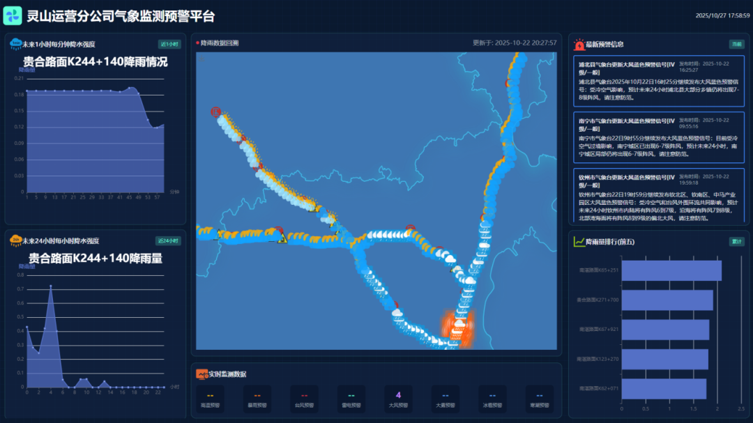 近日,广西新发展交通集团灵山高速公路运营分公司自主研发的高速公路降雨监测预警平台正式落地。该平台通过“线路-点位级精准预警+全周期降雨记录”的创新模式,为降雨场景下的高速公路安全运营提供了智慧化解决方案。