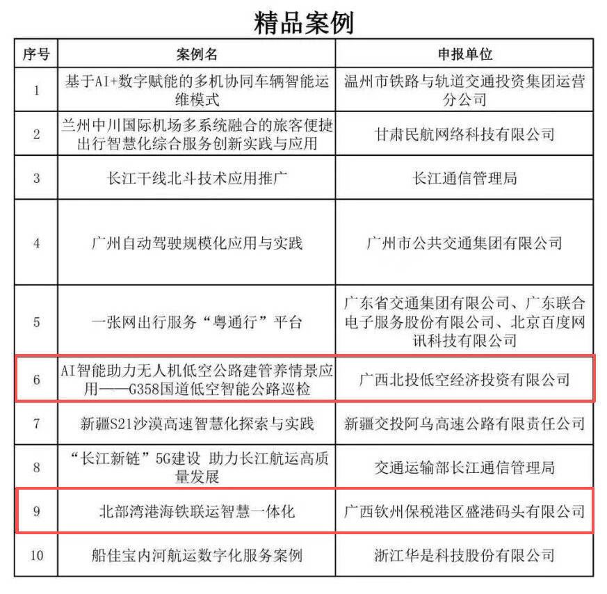 近日,第二届智慧交通应用场景创新实践优秀案例名单公布,广西3个案例上榜。其中,“基于低空智能与高精北斗的港口理货系统研发与应用”案例获评“智慧交通应用场景创新实践十佳案例”“AI智能助力无人机低空公路建管养情景应用——G358国道低空智能公路巡检”“北部湾港海铁联运智慧一体化建设”2个案例获评“智慧交通应用场景创新实践精品案例”