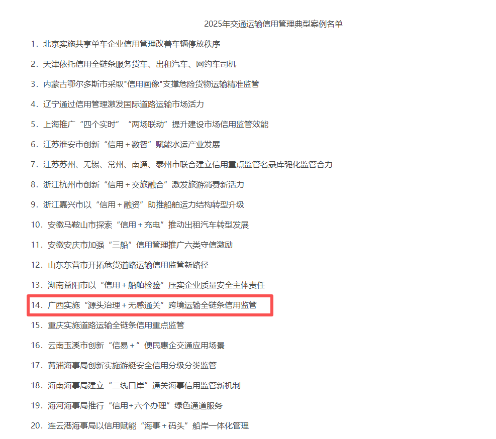 近日,交通运输部公布了2025年交通运输信用管理典型案例名单。其中,由广西壮族自治区交通运输厅推荐的《广西实施“源头治理+无感通关”跨境运输全链条信用监管》案例成功入选,为全国边境口岸跨境运输信用治理提供了实践样本。
