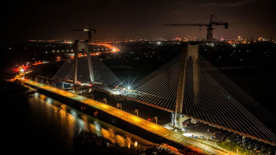 为推进桥梁主梁中跨顺利合龙,平陆运河建设管理团队精心组织、科学施工,采取“落地钢管支架现浇+牵索挂篮悬浇”组合工艺,以精细化施工管控为核心,实现工序高效衔接与过程精准控制。施工中运用全站仪、应力传感器等设备,对梁体位移与应力状态进行全程跟踪监测,将合龙段轴线偏差严格控制在毫米级范围内,确保长达270米主跨实现高精度对接。同时,创新采用“塔梁同步”施工工艺,统筹优化资源配置与工序安排,显著提升施工效率,为工程高质量推进提供了有力支撑。