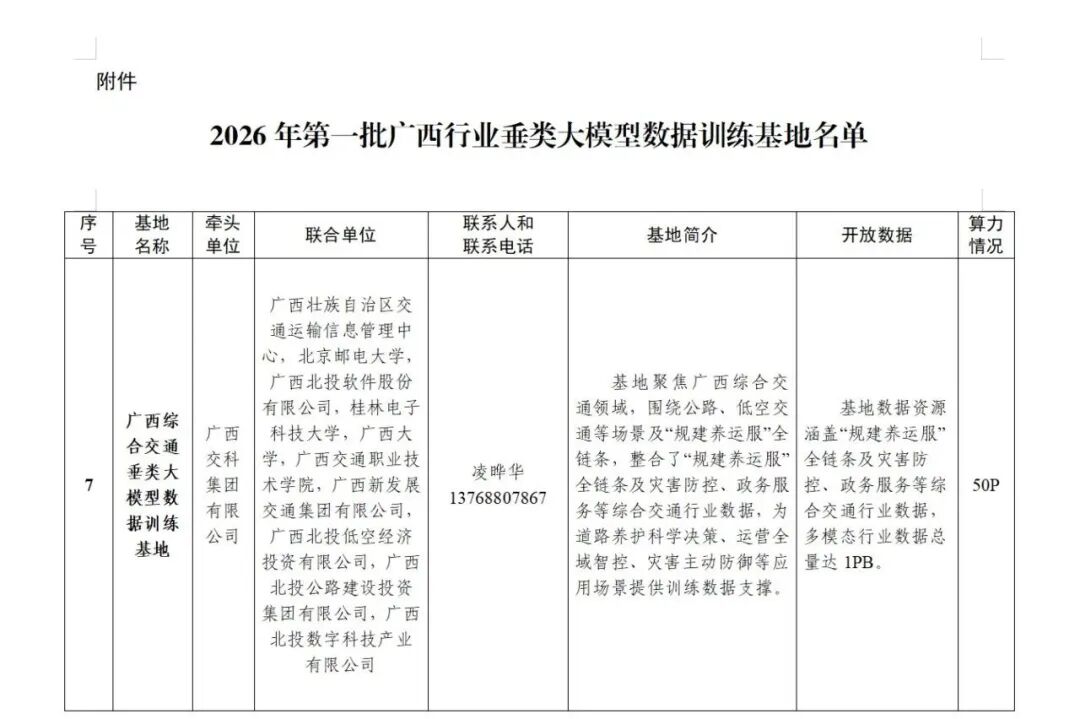 广西综合交通垂类大模型数据训练基地入选2026年第一批广西行业垂类大模型数据训练基地。