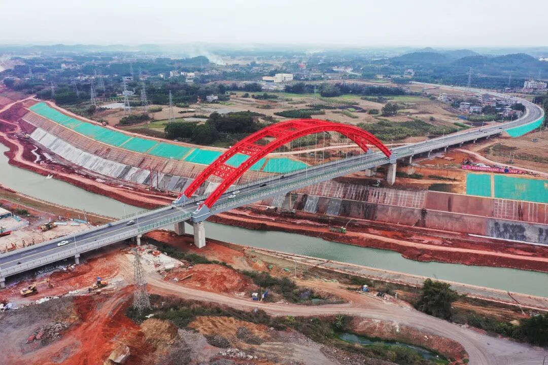 北环路跨江桥全长769.24米,其中主桥长372米,引桥长397.24米。主桥为计算跨径330米的中承式钢管混凝土拱桥,桥面宽43米,设双向6车道及非机动车道、人行道,是平陆运河跨线桥梁工程中跨径最大的钢管混凝土拱桥。作为连接钦州主城区与河东新区的重要纽带,新桥将极大缓解两岸交通压力,优化城市路网,促进“一江两岸”协同发展。