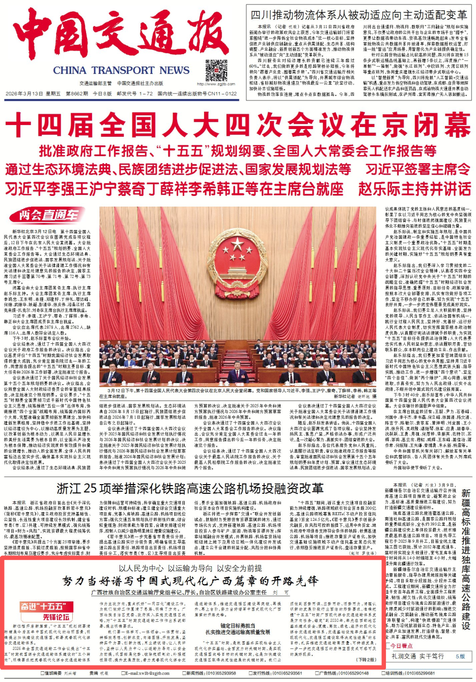 3月13日,《中国交通报》刊登了自治区交通运输厅党组书记、厅长,自治区铁路建设办公室主任刘可署名文章《以人民为中心 以运输为导向 以安全为前提 努力当好谱写中国式现代化广西篇章的开路先锋》,全文如下: