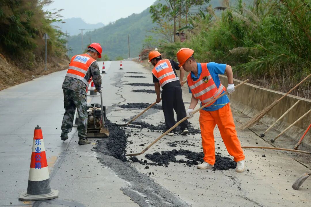 乐业公路养护中心养护人员修补路面病害。