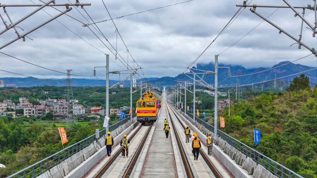 南珠高铁玉岑段(不含省界段)站后“四电”工程接触网专业,需安装接触网支柱3910根,架设接触网导线223.784条公里、附加线435.802条公里。当前项目“四电”施工正处于全面攻坚阶段,首条接触网导线架设完成后,各项工序将提速推进,为全线按期建成通车提供有力支撑。