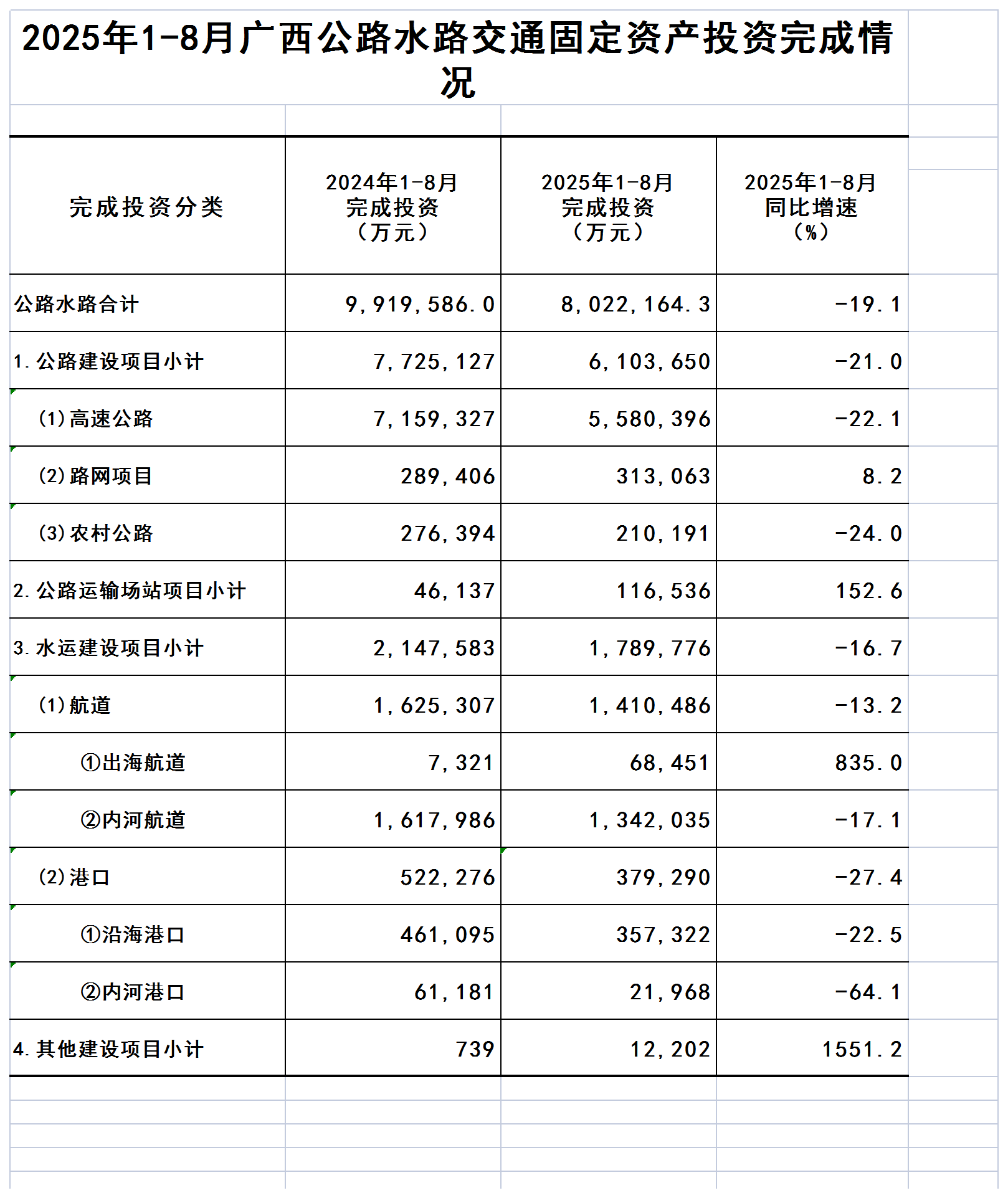2025年1-8月广西公路水路交通固定资产投资完成情况