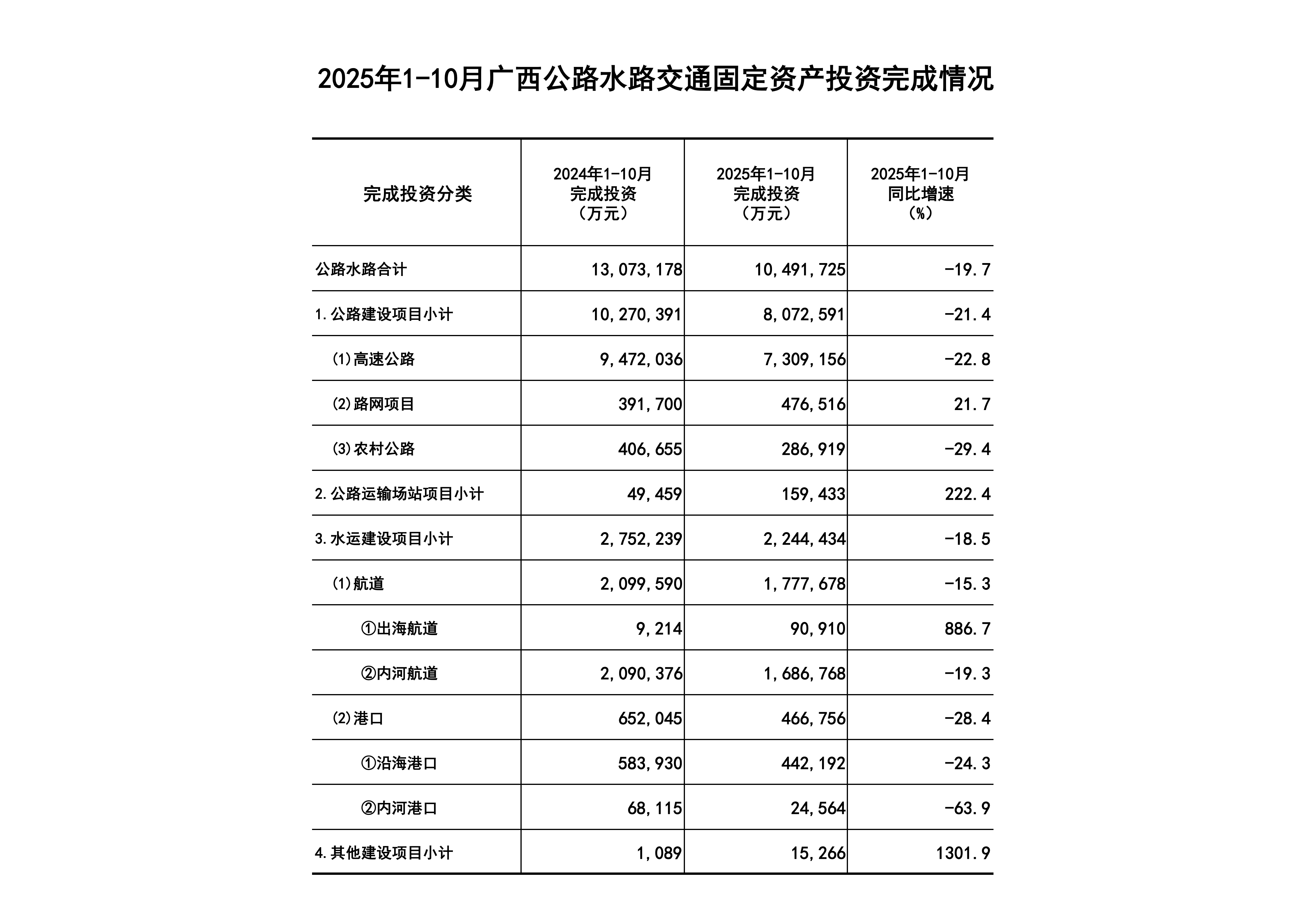 2025年1-10月广西公路水路交通固定资产投资完成情况