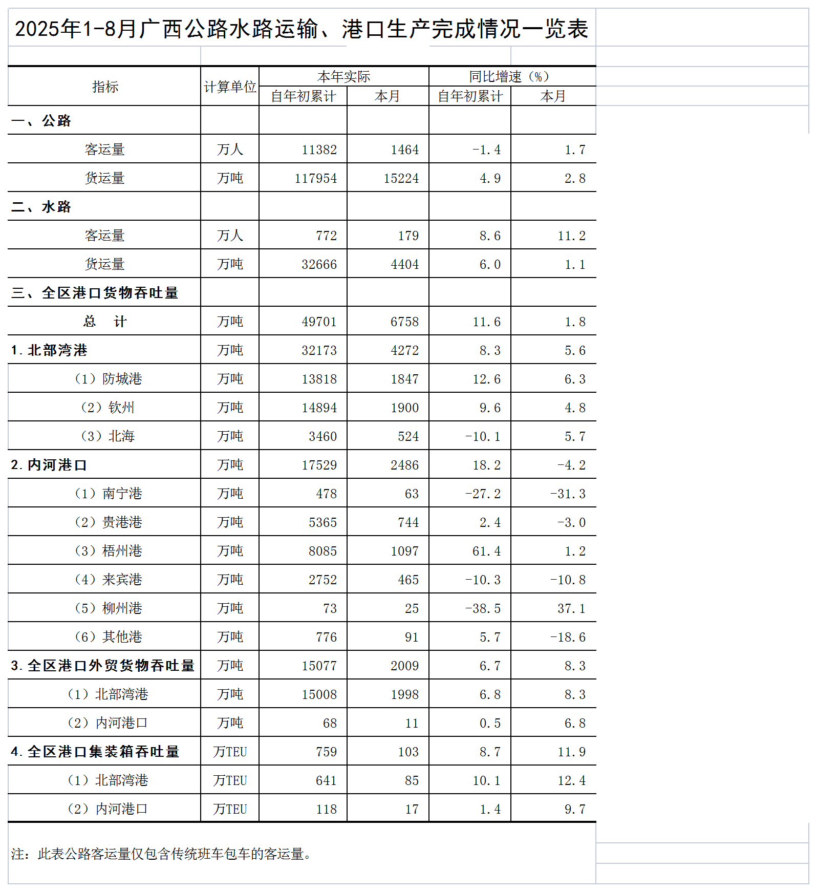 2025年1-8月广西公路水路运输、港口生产完成情况一览表