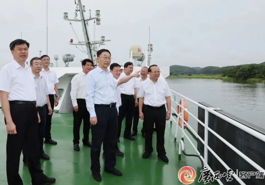 7月29日,自治区党委书记刘宁深入南宁横州市、钦州灵山县实地调研平陆运河项目建设情况。这是刘宁从横州市飞龙渡口乘船,一路沿江察看平陆运河项目建设、航道1标施工和水下施工作业有关情况。广西日报-广西云客户端记者 黄克 摄