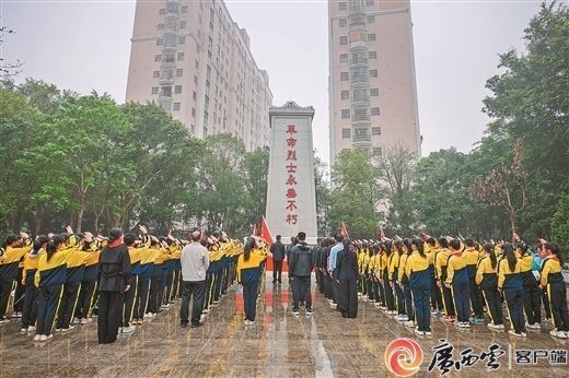 当日,来自钦北区医保局的党员干部胸戴白菊,在碑前重温入党誓词,声音混着雨丝飘向天际。“每年此时,我们都来这里缅怀先烈,告慰忠魂。”该局党组书记潘广招说。钦北区医保局的活动刚结束,钦州市第36小学的“红领巾”就列队走来,200多名师生齐声朗诵,清亮的声音震落松柏枝头的雨珠,在青石板上溅起晶莹的水花。