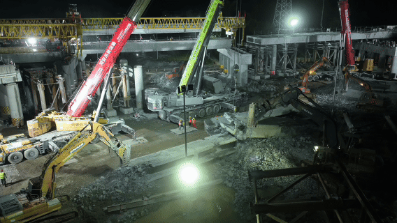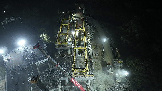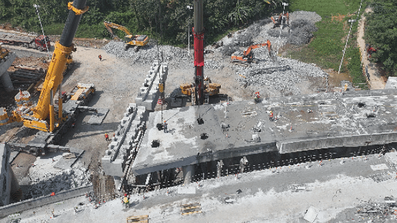 桥梁“拆旧架新”需在6天内完成高强度作业:将4联连续梁精准切割为104块单重约147吨的梁体,既要保证切割精度避免结构坍塌,又要确保梁体及时安全卸除,同时同步跟进新桥梁体架设,“拆”与“架”工序衔接需严格把控。