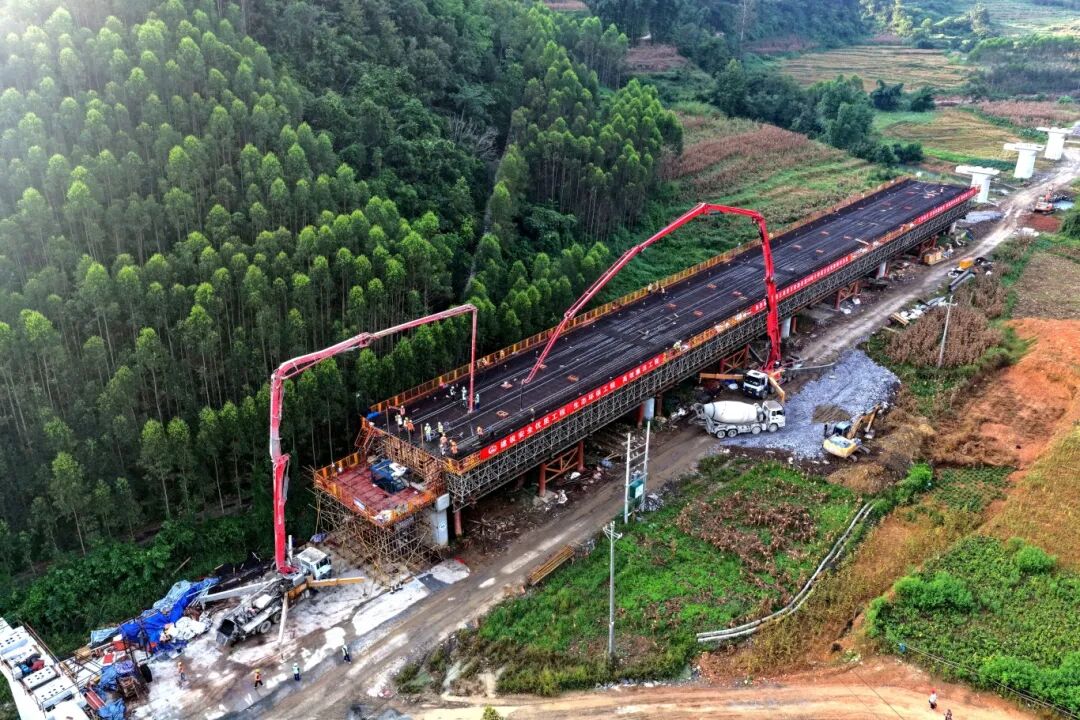 据了解,本次浇筑的道岔连续梁体约130米,横跨5个墩台,采用支架现浇法一次性完成1785立方米混凝土的浇筑,是迄今为止黄百铁路广西段一次性浇筑长度最长、混凝土方量最大的连续梁。为确保施工安全顺利,项目建设团队优化施工方案,严格把关支架搭设、模板拼装、钢筋绑扎、预应力管道安装等工序,对混凝土布料、振捣进行跟踪指导,同时实时观测支架、模板系统的变形与位移,确保混凝土浇筑质量一次成优。