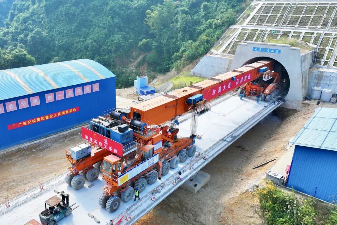 南珠高铁玉林北至岑溪东段由广西交通投资集团投资建设,全线共设置桥梁65座、隧道22座,桥隧比高达84.4%。项目设有3个梁场,共承担1224孔箱梁的架设任务,穿隧过桥跨线是架梁施工的重难点。