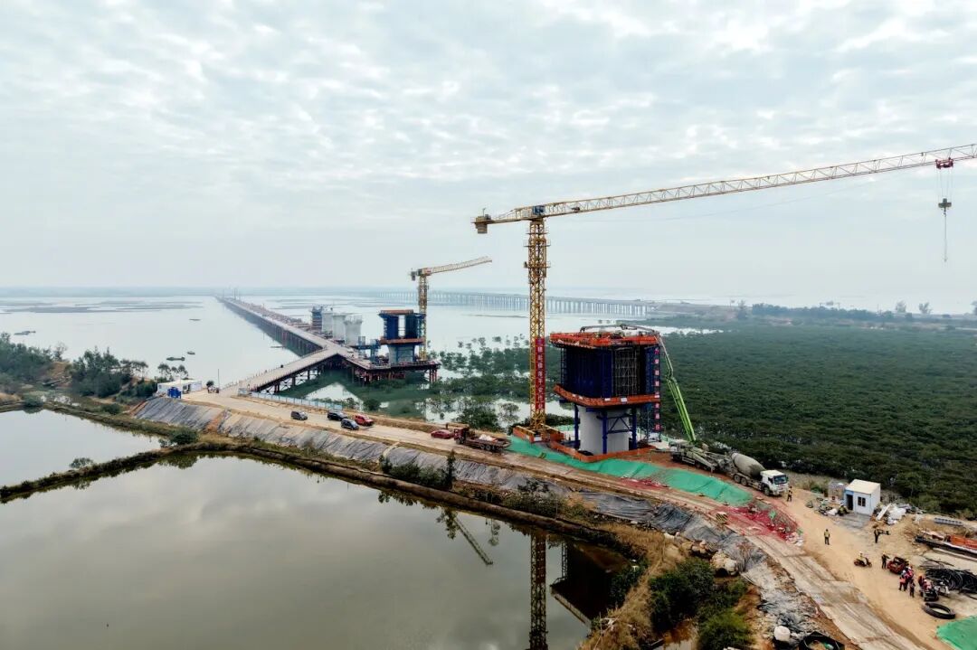 位于广西合浦县境内的铁山港跨海特大桥全长8473.478米,其中近4500米跨越铁山港湾,是广西最长跨海铁路桥梁。该桥共设计连续梁9联,其中跨越铁山港湾部分8联,相比传统简支箱梁设计可以减少桥墩33个,更好地保护施工区域周边的红树林和其他海洋生物。