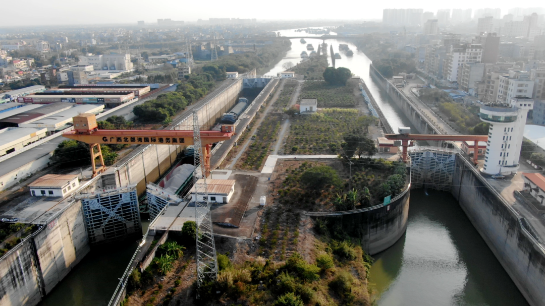 桂平船闸船舶进出闸口。(吴昊 摄)